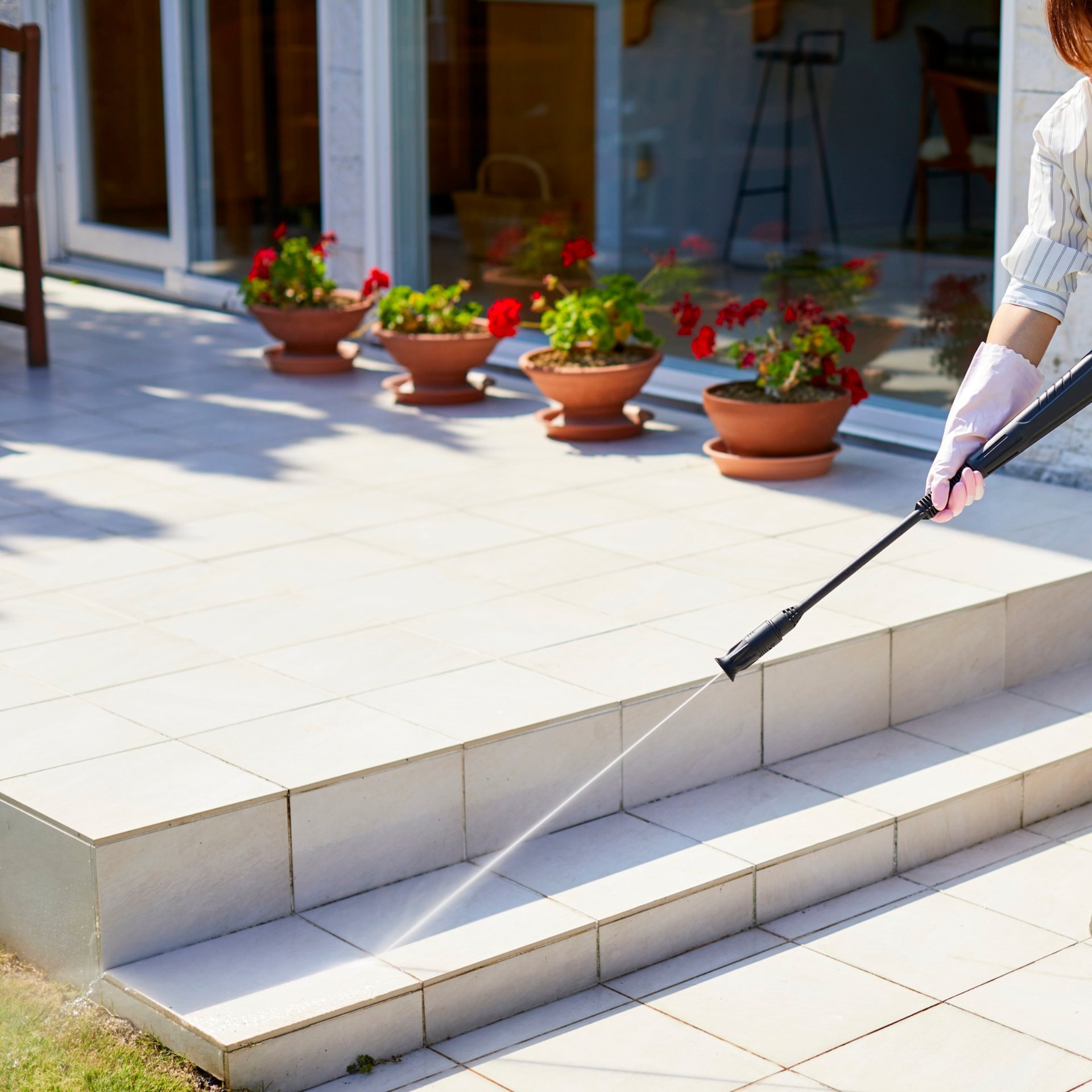 Patio rinsing and finishing uses clean water and professional grade equipment to thoroughly rinse and finish your patio surface after pressure washing. It is the most important final step in the patio cleaning process, but it does require the right technique and attention to detail to ensure every last trace of cleaning solution and debris is removed, leaving a clean, fresh, and streak free finish.